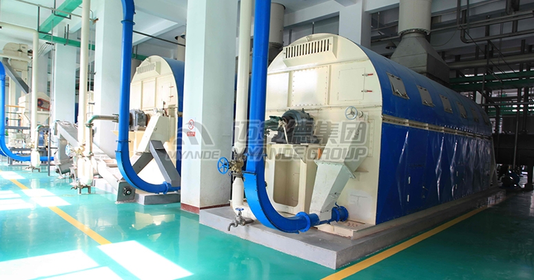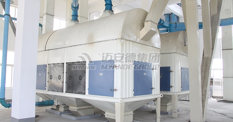 原料清理目的是除去玉米中的铁、砂、石、茎等非原料物质,保证设备正常运行,提高淀粉质量。玉米原料经斗式提升机输送依次进入清理筛、磁选器等设备进行筛选、去石等净化工序,净化玉米计量后进入跳汰机进行湿法去石。