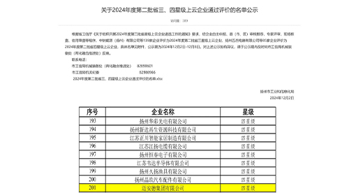 根据省工信厅《关于组织开展2024年度第二批省星级上云企业遴选工作的通知》要求,经企业自主申报、县(市、区)初审推荐、专家评审、现场核查、信用审查等程序,近日,扬州市工业和信息化局公示了省三、四星级上云企业通过评价的名单,迈安德集团榜上有名。这是继今年8月获批为省级三星级上云企业后,同年再次获得省级四星级上云企业。