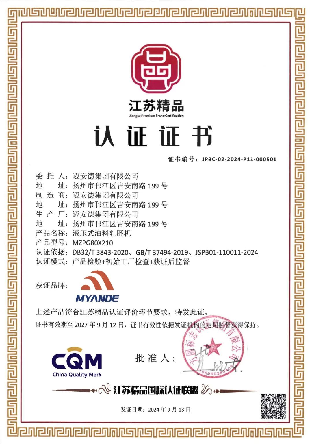 近日,江苏省质量发展委员会办公室联合江苏省市场监管局等九部门发布2024年“江苏精品”认证获证企业名单,迈安德核心产品“油料轧胚机”成功上榜。